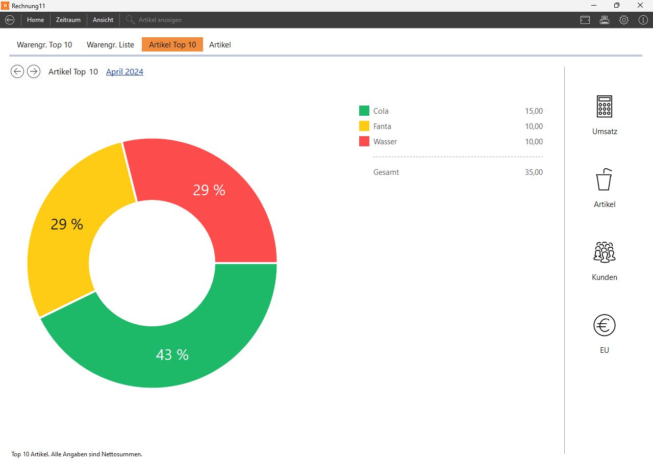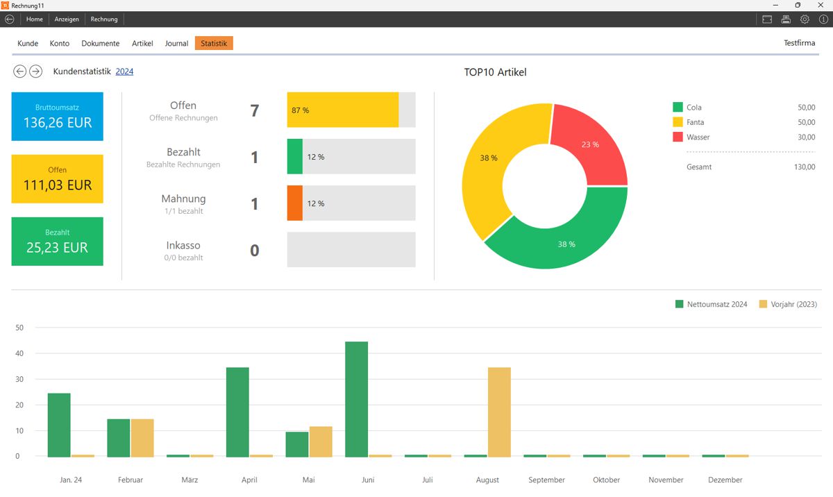 Dans le journal de factures, vous pouvez voir toutes les factures, les crédits, les offres et les commandes pour la période sélectionnée. Si vous utilisez différents taux, vous pouvez également afficher des totaux nets individuels par taux de TVA. Vous pouvez également transmettre directement le journal sous forme de fichier CSV à votre conseiller comptable.