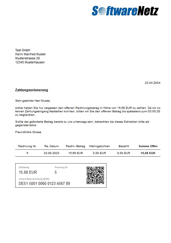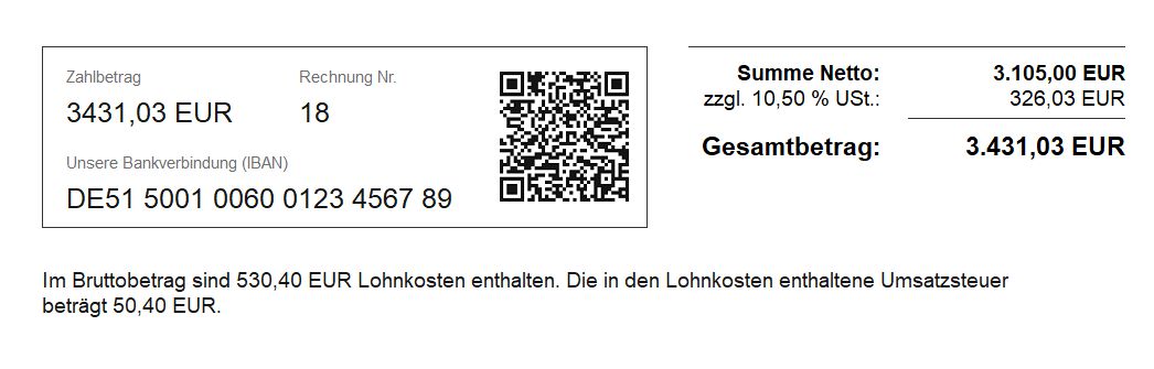 facilitez le virement bancaire pour vos clients en imprimant le GiroCode (code QR) sur chaque facture. Votre client peut alors facilement scanner le code et transférer par TAN avec son téléphone portable et son application bancaire, sans autre saisie! En outre, le numéro IBAN, le montant et le numéro de compte sont imprimés en caractères lisibles à côté du montant total, pour vos clients qui n’utilisent pas de services bancaires mobiles.